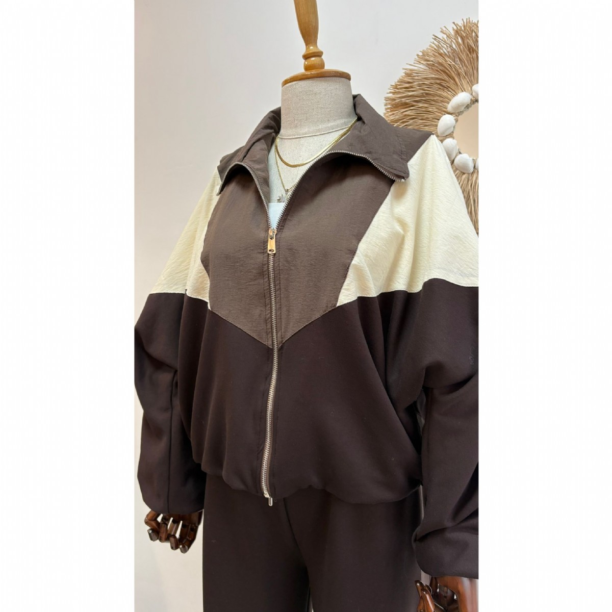 Dinamik kontrast detaylarıyla tasarlanan bu ikili takım, sportif şıklığı günlük konforla buluşturur. Fermuarlı ceket ve bol paça pantolon, rahat kesimiyle gün boyu özgür hareket imkânı sunar.